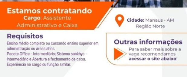 Nascimento Rh seleciona pessoas em Manaus para Assistente Administrativo. Confira os requisitos e encaminhe o seu currículo